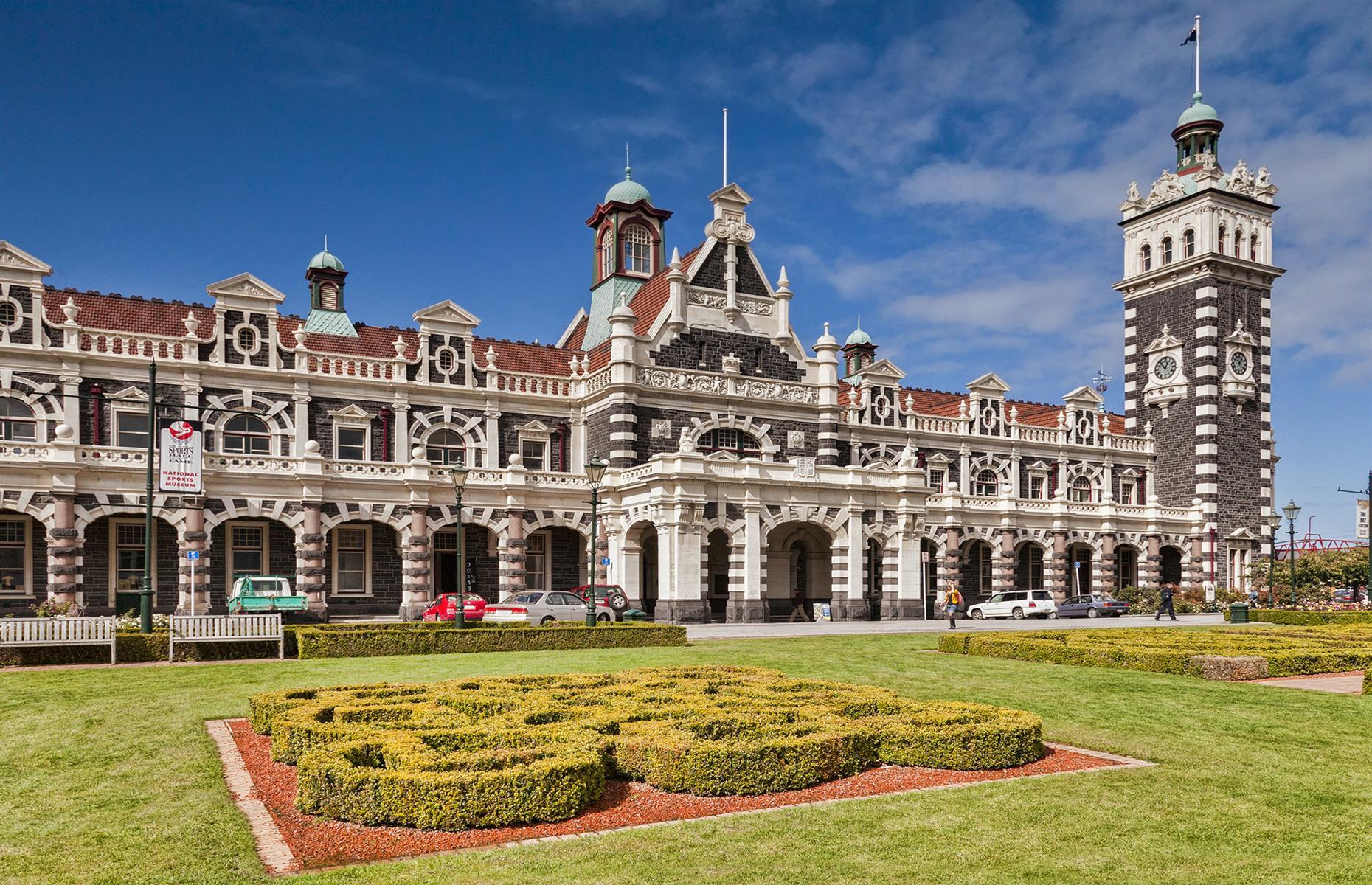 Often called the Gingerbread House, Dunedin station's white Oamaru limestone on black basalt rock gives it its characteristic appearance. Although no longer a working station, it remains one of Dunedin's most prominent landmarks and is open to public to marvel at the ornate interiors and exterior. A restaurant takes up much of the ground floor and the adjacent parking lot is transformed into the Otago Farmers Market every Saturday.